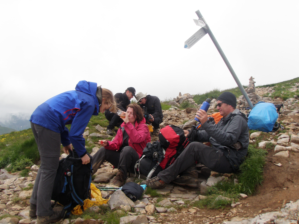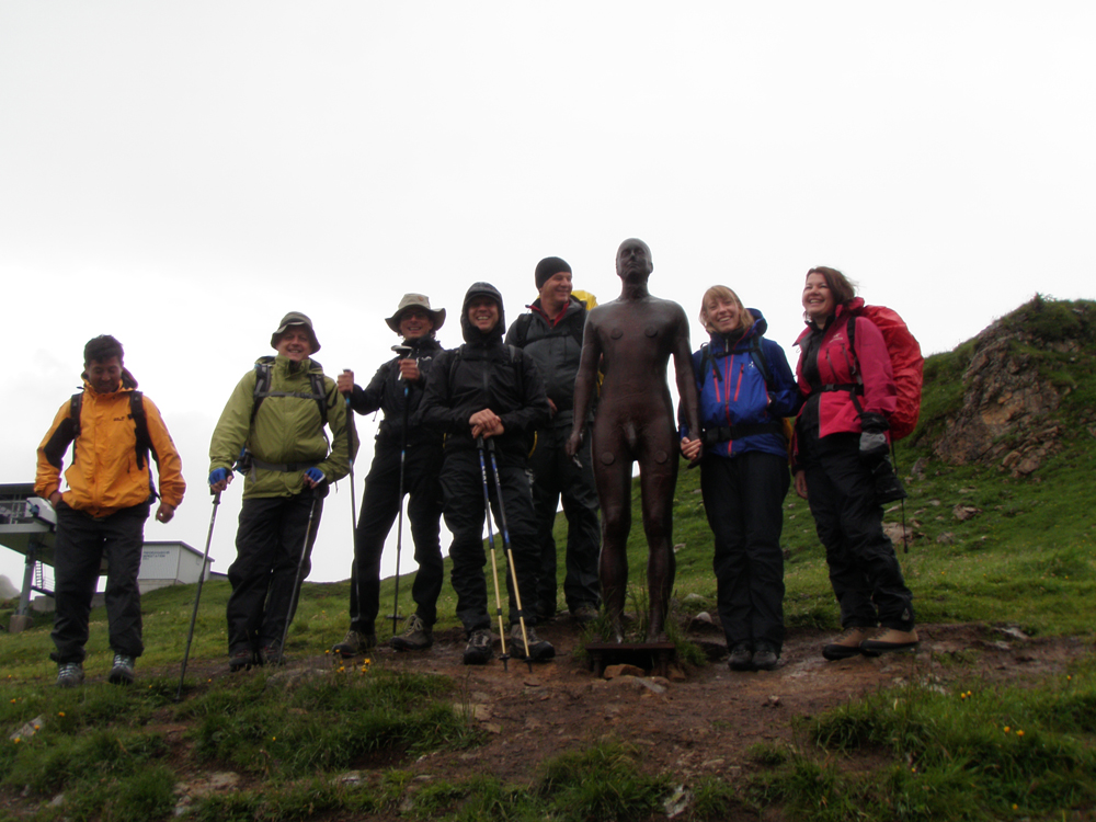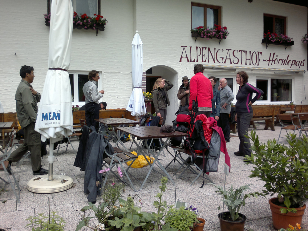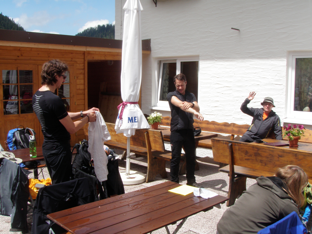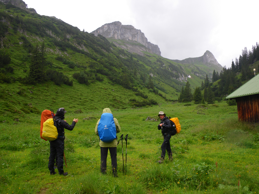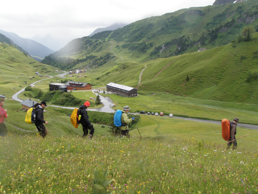 In der Nacht auf Donnerstag erreichte uns eine kleine Kaltfront, darum fiel auch die morgendliche Steinbockschau flach. Wir wählten als Abstieg die kurze Variante nach Zug bis zum Älpele, von wo wir mit dem Wanderbus nach Lech weiterfuhren. Die Überängstlichen starteten am Morgen noch in Regenmontur (sogar der Kazi hatte keine Nerven), wobei es in kürzester Zeit aufriss – nach einem Kurzbesuch auf dem Lecher Markt beendeten wir die Tour wieder standesgemäß im Fünf-Stern-Superior-Hotel Aurelio. Nicht wirklich billig, aber sehr gemütlich, und lecka! Zwei ganze und zwei halbe Tage waren wir zu Fuß unterwegs, mit dem Taxi ging es in 1 Stunde 10 Minuten wieder zum Ausgangspunkt der Tour in Dornbirn zurück.